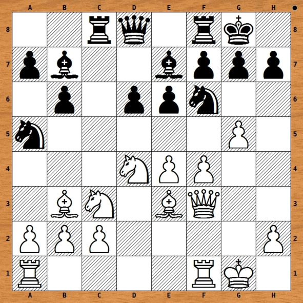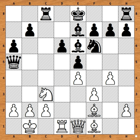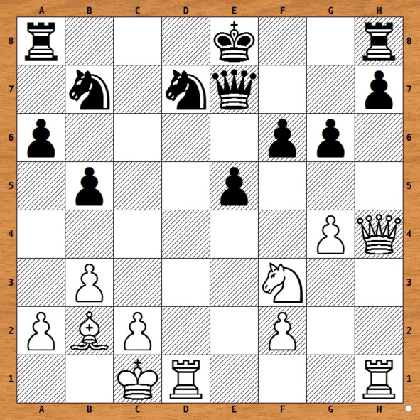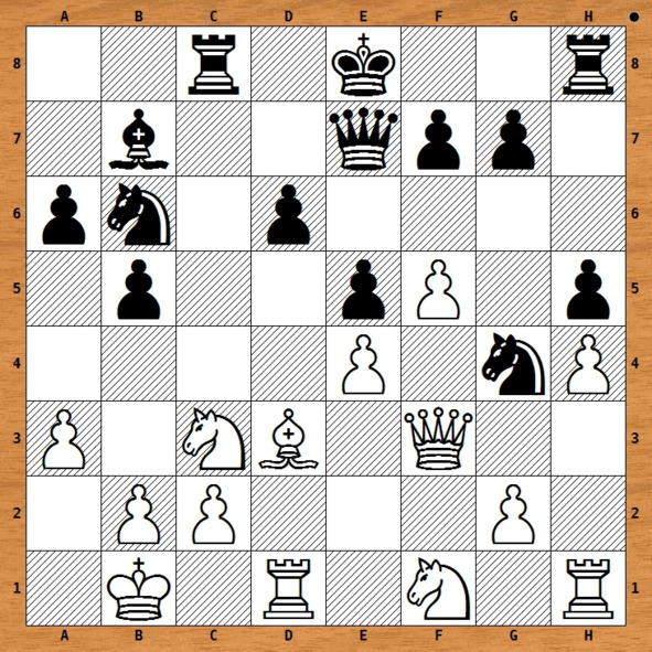 1. e4 e52. Nf3 d63. d4 f54. Nc3 fxe45. Nxe4 d56. Ng3 e47. Ne5 Nf68. Bg5 Bd69. Nh5 O-O10. Qd2 Qe811. g4 Nxg412. Nxg4 Qxh513. Ne5 Nc614. Be2 Qh315. Nxc6 bxc616. Be3 Rb817. O-O-O Rxf2Конец ознакомительного фрагмента.