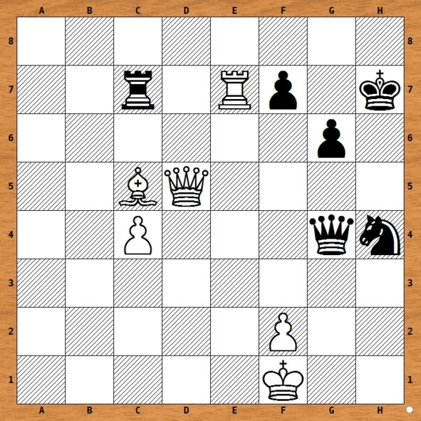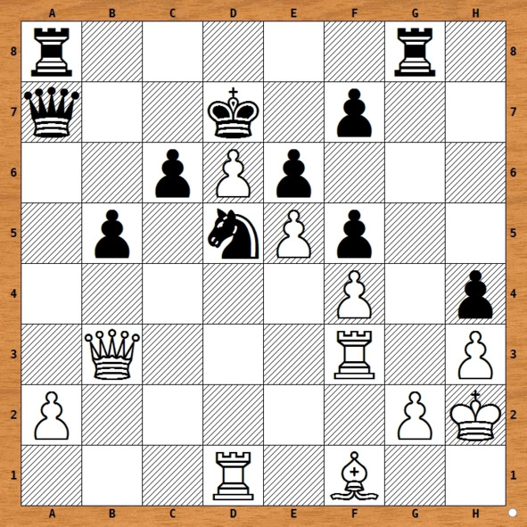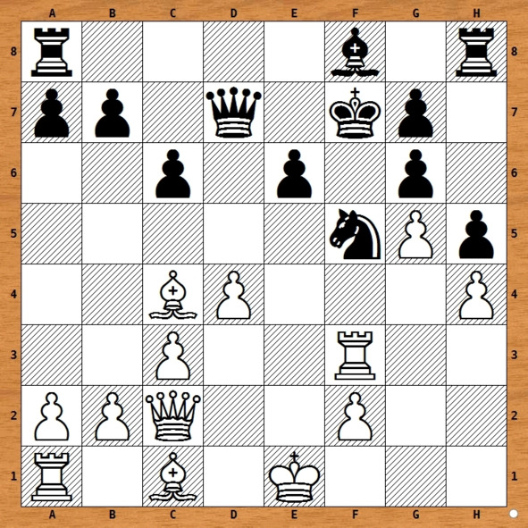 1. e4 e52. f4 exf43. Bc4 d54. Bxd5 Nf65. Nc3 Bb46. Nf3 O-O7. O-O Bxc38. dxc3 c69. Bb3 Qb6+10. Kh1 Nxe411. Qe1 Bf512. Nh4 Re813. Bxf4 Nf614. Qg3 Bg615. Nxg6 hxg616. Bxb8 Raxb817. Rxf6 gxf618. Qxg6+ Kh819. Bxf7 Qe320. Qxf6+ Kh721. Bg6+ Kg822. Qf7+ Kh823. Qh7#ГУСТОНЕ-БЛЮМА (1979, по мотивам партии)