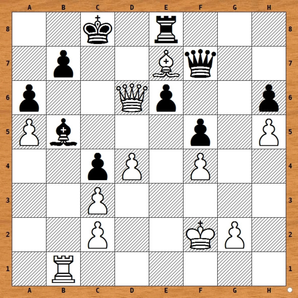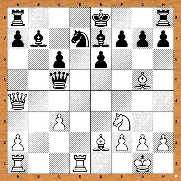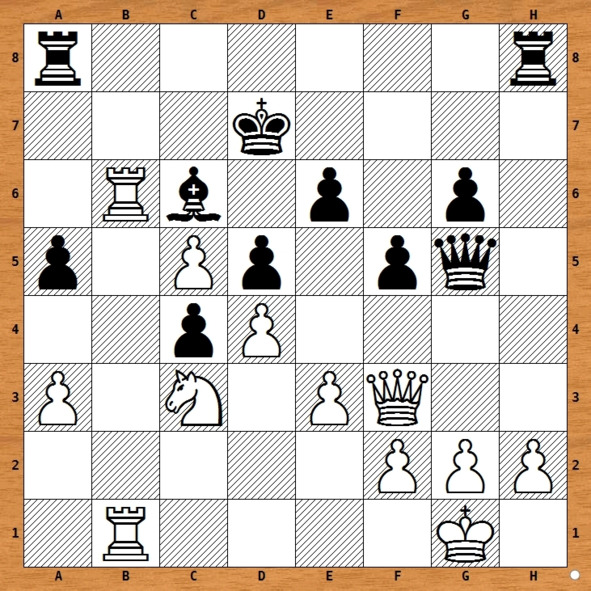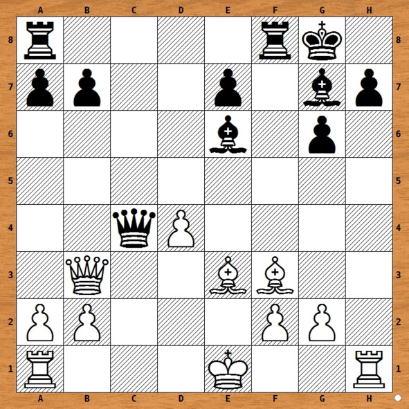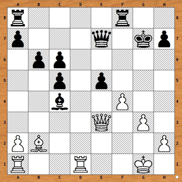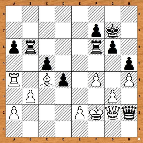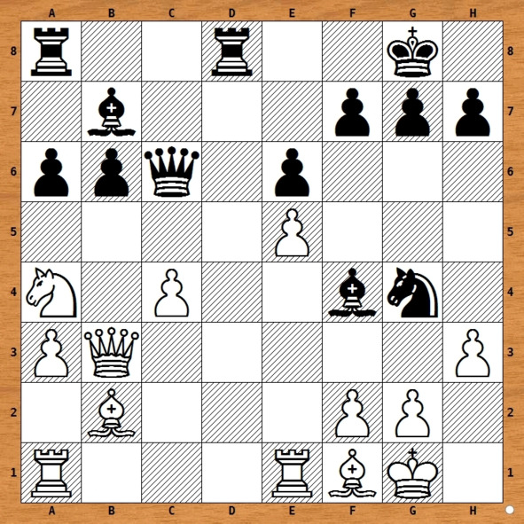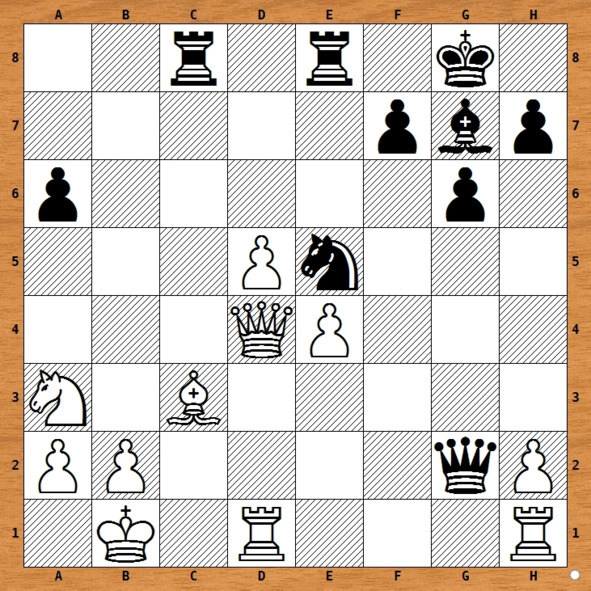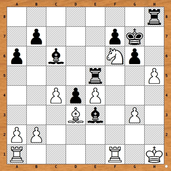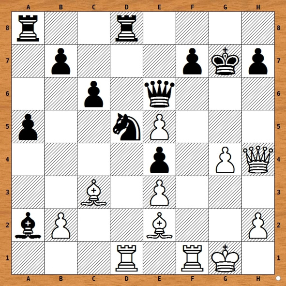 1 e4 e52 Nf3 Nc63 Bc4 Bc54 b4 Bb45 c3 Bc56 O-O d67 d4 ed48 cd4 Bb69 Nc3 Nf610 e5 d511 ef6 dc412 fg7 Rg813 Re1 Be614 d5 Qf615 Bg5 Qc316 de6 Qd317 ef7 Kf718 Re7 Kg619 Qe1 Qd520 Rd1 Nd421 Rd4 Bd422 Qb1 Qf523 Nh4 Kg524 Qf5 Kh625 g4 Bf226 Kg2БЕРД-МОРФИ (1858)