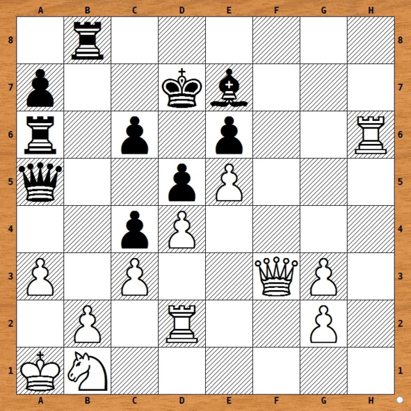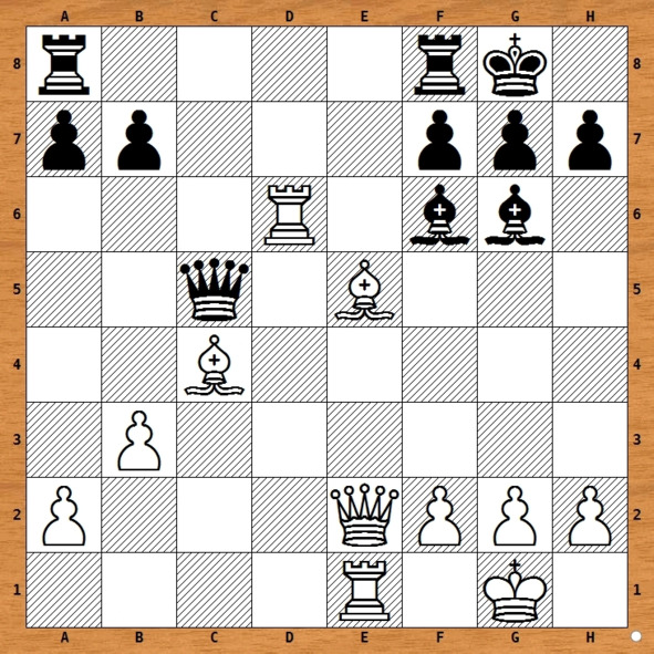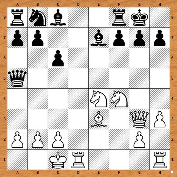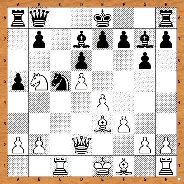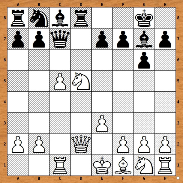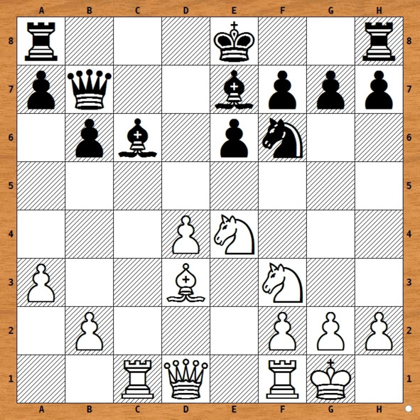 1. d4 d52. Nf3 e63. e3 Nf64. Bd3 Nbd75. O-O b66. Nbd2 Bd67. e4 dxe48. Nxe4 Bb79. Nxd6+ cxd610. Bf4 Bxf311. Qxf3 d512. Bd6 Rc813. Rfe1 Rc614. Ba3 a515. c4 Ne416. cxd5 Ng517. Qg3 Rc818. dxe6 Nxe619. Rxe6+ fxe620. Qg6+ hxg621. Bxg6#ЭРНАНДЕС-ШУМАХЕР (ЛЮЦЕРН 1982)