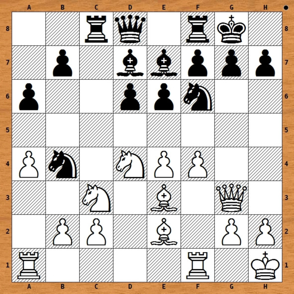 1. e4 c52. Nf3 Nc63. d4 cxd44. Nxd4 Nf65. Nc3 d66. Be2 e67. O-O a68. Be3 Qc79. f4 Na510. f5 Nc411. Bxc4 Qxc412. fxe6 fxe613. Rxf6 gxf614. Qh5+ Kd815. Qf7 Bd716. Qxf6+ Kc717. Qxh8 Bh618. Nxe6+ Qxe619. Qxa8 Bxe3+20. Kh1 c выигрышемПИЛЬСБЕРИ-NN (ТОРОНТО 1899)