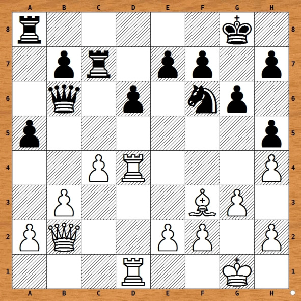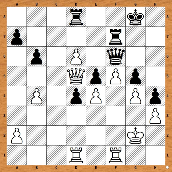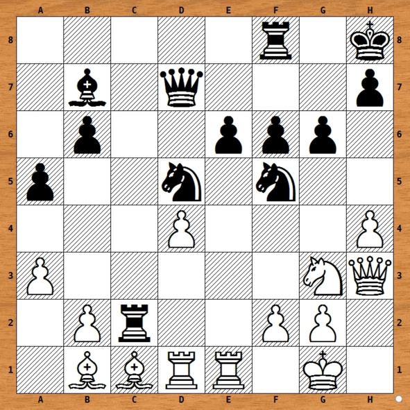 1. Nf3 Nf62. c4 e63. Nc3 d54. d4 c65. e3 Ne46. Bd3 f57. Ne5 Qh48. O-O Nd79. f4 Bd610. Bxe4 fxe411. Qg4 Qh612. Bd2 Nf613. Qe2 g514. fxg5 Qxg515. Rxf6 Qxf616. Qh5+ Ke717. Rf1 Bxe518. Rxf6 Bxf619. Nxe4 dxe420. Bb4+ Kd821. Qh6 Bxd422. exd4 Bd723. Qf6+ с выигрышем.МАРОЦИ-ТАРТАКОВЕР