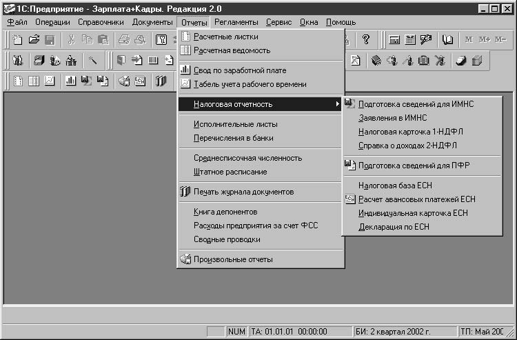 В предложенном списке отчетов присутствуют специфические нормативные отчеты, которые требуются в аудиторских проверках и налоговых инспекциях. Это отчеты группы Налоговая отчетность (рис. 1.4). Названные отчеты подытоживают первичные документы и являются показателем корректности ведения учета заработной платы. Отчеты, сформированные программой для пенсионного фонда и налоговой инспекции на внешнем носителе, являются рабочими документами для этих органов. Особенности формирования этих и других отчетов мы рассмотрим в главе 7. Сформировать необходимый отчет вы можете в меню Отчеты (рис. 1.4).