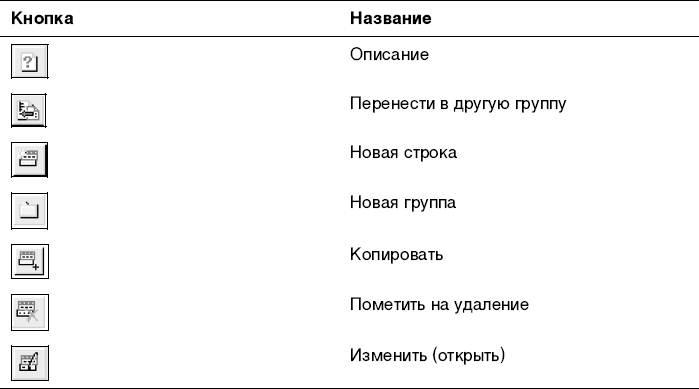 Для всех компонентов программы определены общие действия, которым назначены определенные кнопки. Желательно запомнить эти кнопки сразу, хотя всегда есть возможность обратиться к меню Действия и выбрать нужное действие из него. Навыки работы с правой клавишей мыши позволяют быстро вызвать это же меню в любом месте окна. В дальнейшем мы будем пользоваться названиями кнопок, приведенными рядом с изображением. Изображения кнопок и соответствующие им действия представлены в табл. 2.1.