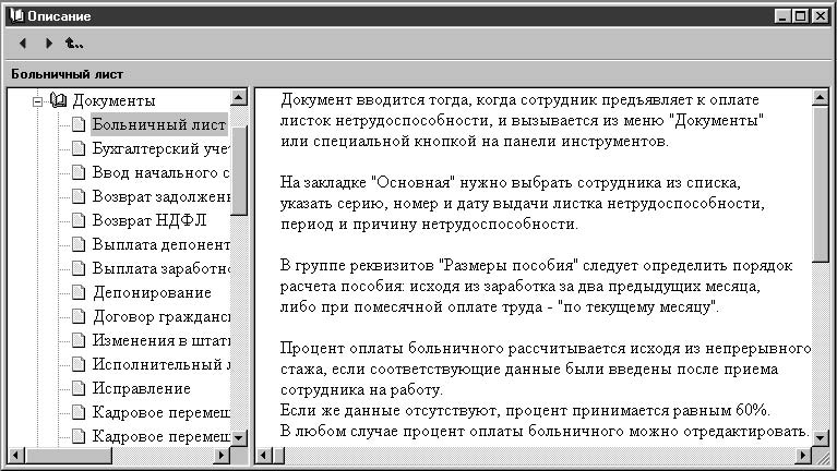 Меню Помощь используется в том случае, когда необходимо получить описание режимов и методов работы с открытым окном. Окна одинаковых компонентов, например, справочники, имеют одинаковые панели инструментов и одинаковые режимы и методы работы в них. Если режим в выбранном справочнике не используется или для текущего элемента недоступен, то соответствующая кнопка не активна. Поэтому дается общее описание для всех элементов компонента. Например, для справочника "Сотрудники" будет предложено описание "Справочники", как, впрочем, и для всех остальных справочников.