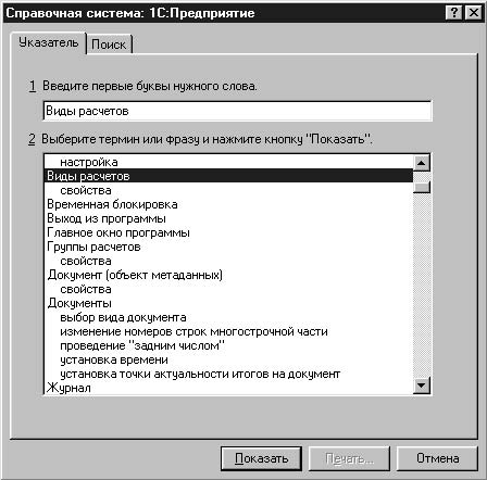 Щелчком мыши в меню Разделы вызывается диалоговое окно Справочная система (рис. 2.4). Поиск по наименованию разделов возможен на вкладке Указатель, по наименованию подразделов (искомых ключевых слов) – на вкладке Поиск. Для показа самого описания необходимо нажать кнопку Показать. Увидеть весь перечень описаний можно, выбрав пункт Содержание.