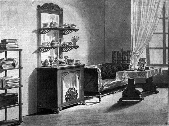 Ил. 1. Жилая комната-кабинет Крылова. Гравюра К. О. Брожа по рис. А. Ф. Эйхена конца 1830‑х гг. (?).