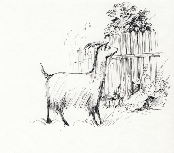 Козы пасутся на лугу за деревней, но если их оставить без присмотра, так и норовят залезть в чей-нибудь сад или огород. Там растения и кустарники вкуснее, чем на лугу. Одна смородина чего стоит!