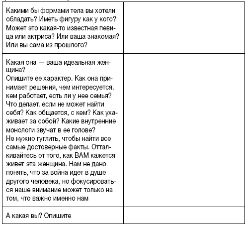 Это задание не для того, чтобы придумать себе образ идеала и начать стремиться БЫТЬ им. Оно для того, чтобы увидеть, какие КАЧЕСТВА вы не позволяете раскрыть в себе самой, а требуете этого от своего тела. Если образец, который вы вспомнили, – легкая на подъем, веселая, открытая и сексуальная кокетка в «эске», а вы тяжело воспринимаете все новое, вам трудно радоваться мелочам, в безопасности вы себя ощущаете только будучи закрытой от всех и тогда ваше тело будто вместо вас говорит своим «триикселем»: «Не пялься, зашибу!» Тогда возникает ряд хороших вопросов к себе: зачем я это делаю?