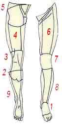 1 – область подошвы; 2 – задняя область голени; 3 – задняя область коленного сустава; 4 – задняя область бедра; 5 – ягодичная область; 6 – передняя область бедра; 7 – передняя область коленного сустава; 8 – передняя область голени; 9 – область тыла стопы.