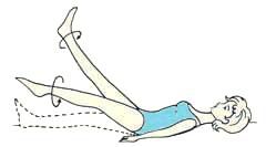 11. Исходное положение то же. Поднимите, выпрямленные в коленях, ноги и одновременно выполняйте ими круговые движения то вправо, то влево (см. рис. 42). Ноги при этом держите вместе.