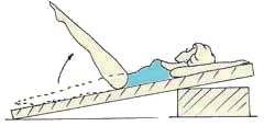28. Лягте на наклонно поставленную скамейку головой вверх. Руками держитесь за ее верхний край. Поднимайте как можно выше (см. рис. 51) и опускайте прямые ноги.