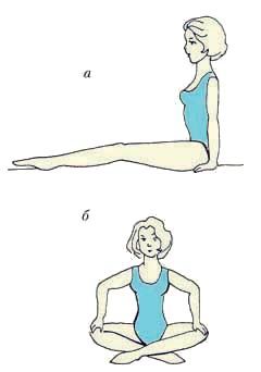 3. Сядьте на пол, выпрямите ноги, руками обопритесь о пол (см. рис. 54а). Медленно смените положение ног сев “по-турецки”. Руки положите на колени и сильно на них надавите (см. рис. 54б). Вернитесь в исходное положение. При выполнении этого упражнения спина должна быть прямой, а голова поднята.