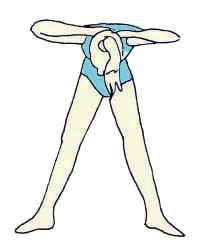 27. Выпрямите плечи, руки немного отведите от туловища, ладонями обопритесь о пол. Делайте движения ногами, как будто плывете брассом, то есть медленно подтягивайте ноги к животу, при этом колени должны быть развернуты, а пятки вместе (см. рис. 50), и резко опустите ноги на пол, быстро соединив их вместе.