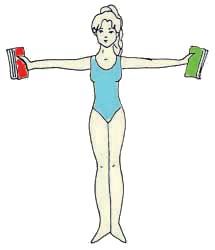 5. Встаньте прямо, в руки возьмите эспандер или резинку и заведите его за спину. Теперь растягивайте эспандер (резинку) разводя руки в стороны-вверх (см. рис. 77).