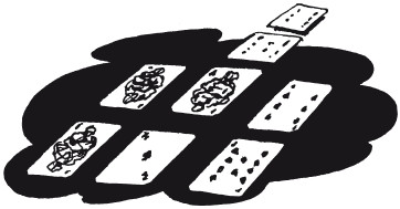 После этого снова соберите карты и разложите их на 4 части, причем та, что была верхней в первой части, снова должна оказаться в том же положении. Несоответствующие масти опять нужно отбросить.