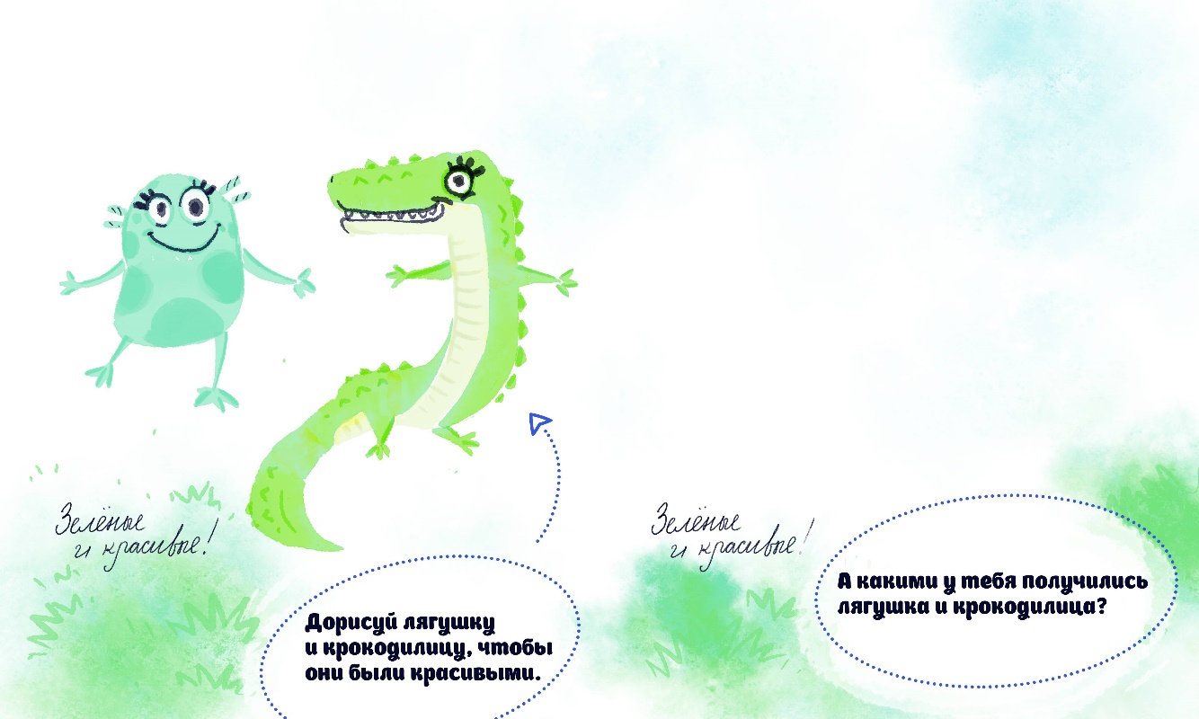 – Сейчас лягушка с крокодилом на тебя обиделись, – сказала мама и написала: «Зелёные и красивые». – Давай нарисуем лягушку и крокодила красивыми.