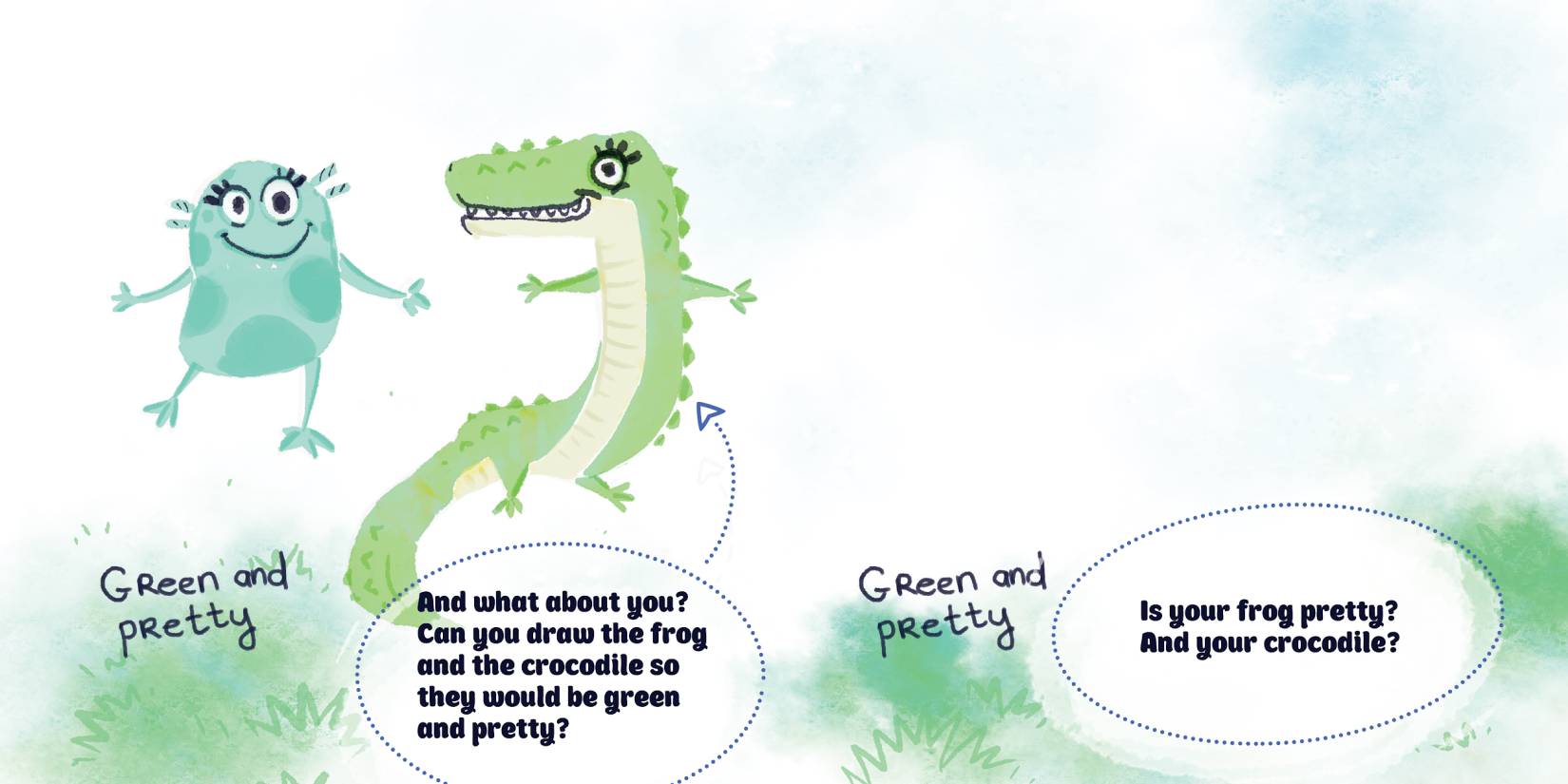 “No? Just try it! Paint a nice frog and crocodile, with happy eyes and warm smiles!”