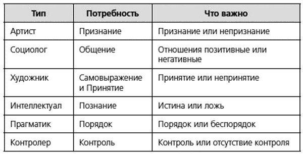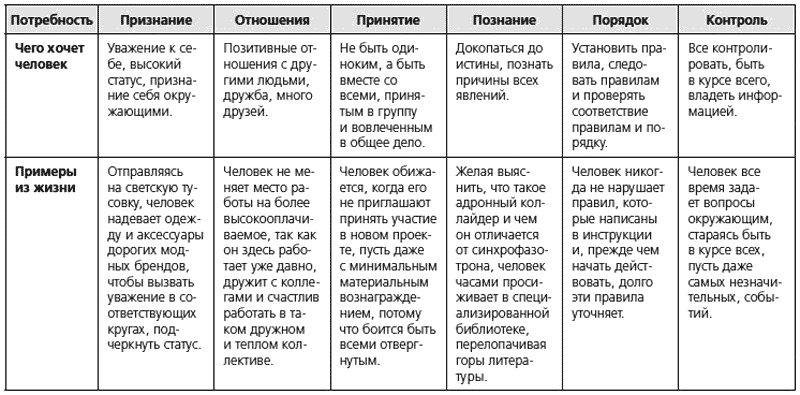 У каждого человека есть шесть ключевых потребностей, но развиты они не одинаково: одна или две ключевые потребности всегда преобладают. Например, одному человеку настолько важно позитивное общение, что он жертвует ради него даже истиной, соглашаясь с заведомо ложным мнением ради сохранения отношений с оппонентом, потому что его ключевая потребность – общение. Для другого человека, напротив, важно отстоять мнение, которое он считает истинным, и он спорит до хрипоты, портя отношения с другими, потому что его ключевая потребность – познание истины. Третий выступает на совещаниях ради создания уважаемого имиджа, так как главное для него – признание. Четвертый выступает на совещании, потому что выступать – это его должностная обязанность.