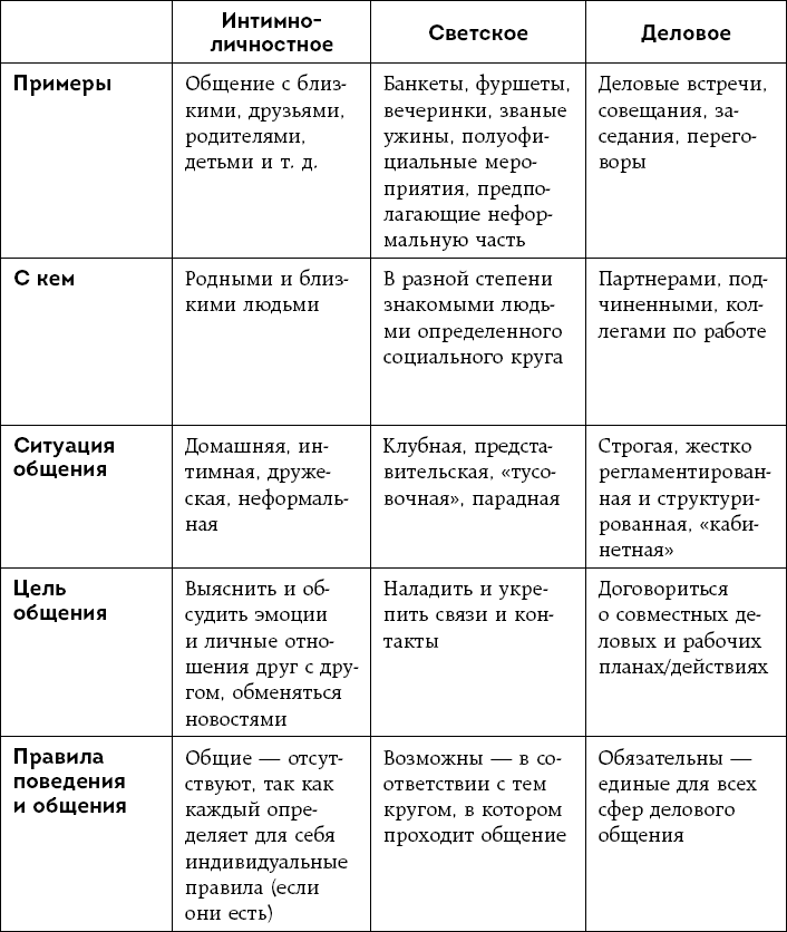 Из таблицы мы видим, что деловое общение сильно отличается от интимно-личностного и светского тем, что, в отличие от первых двух, оно требует конкретных результатов, выражающихся в цифрах и выгодах. Именно поэтому, для упрощения общения в сфере бизнеса и помощи людям в достижении успеха, деловое общение всегда имеет общие, единые правила и структуру. Именно благодаря этому единству правил владельцы бизнеса из самых разных стран и континентов могут быстро договориться друг с другом, зачастую даже не вполне владея общим языком. В то же время деловое общение – это очень красивый и гармоничный процесс взаимодействия людей, позволяющий достичь результата, который не дает ни интимно-личностное, ни светское общение, – ощущение взаимной увлеченности конкретной целью и резонанс интересов.