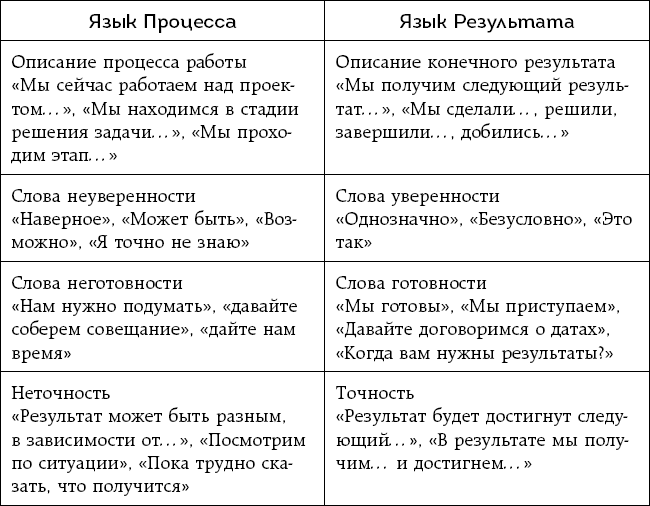 В любом общении собеседники могут разговаривать на Языке Процесса или на Языке Результата. Ниже приведена сравнительная таблица основных свойств этих двух видов языка.