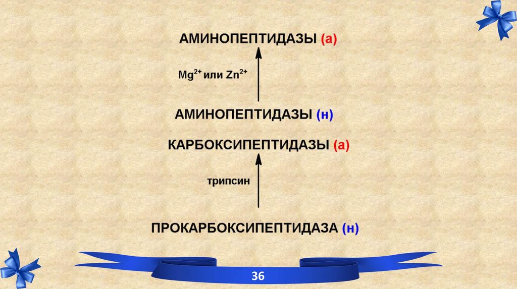 Трипсин – эндопротеиназа, (рН-7,8) действует на пептидные связи, образованные СОО- группами АРГИНИНА и ЛИЗИНА. Образуются низкомолекулярные пептиды.
