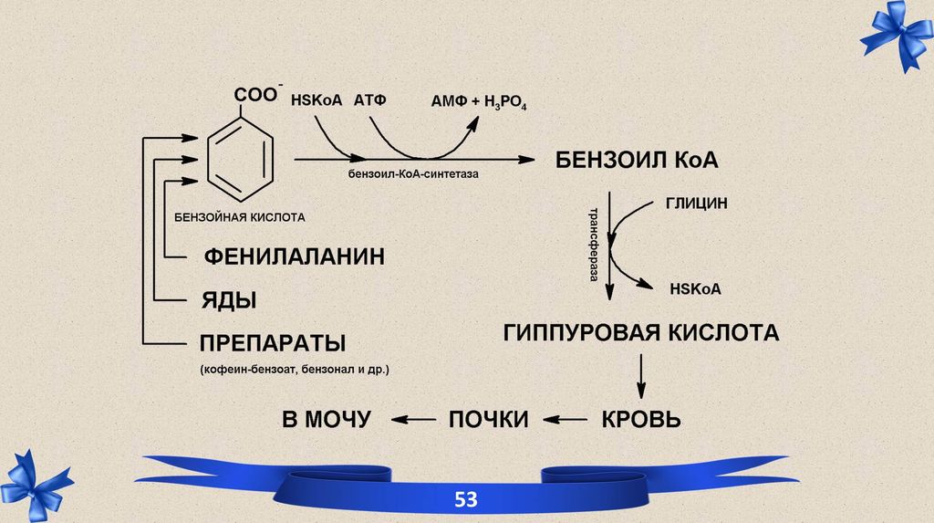 Гиппуровая кислота – продукт обезвреживания бензойной кислоты. Образуется в печени при участии ГЛИЦИНА.