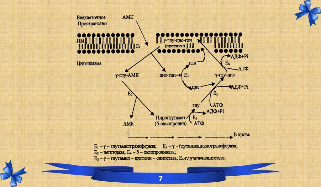 Ключевая роль принадлежит γ-глутамил-трансферазе, кофактор – глутатион (γ-глутамил-цистеинил-глицин). Аминокислота сое-диняясь с γ-глутаминным остатком образует дипептид который и переносится внутрь клетки, далее аминокислота уходит в кровь, а глутатион ресинтезируется при участии (Е3, Е4, Е5, Е6) и цикл вновь повторяется. Всасавшиеся аминокислоты через кровь поступают в органы и ткани. В плазме крови их концентрация (в пересчёте на N) составляет