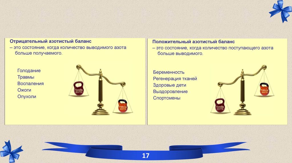 Азотистый баланс – это отношение количества азота поступившего с пищей к количеству азота теряемого организмом с мочой, фекалиями, потом в составе азотсодержащих соединений (мо-чевины, мочевой кислоты, креатинина и др.).