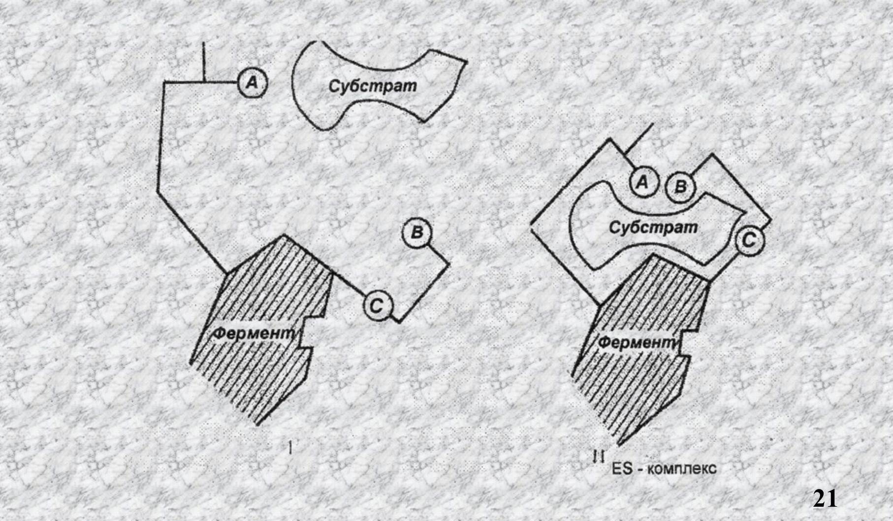 Согласно теории «индуцированного соответствия» Кошленда, присоединение S к Е вызывает соответствующие изменения конформации А.Ц., что ведёт к образованию ES комплекса.