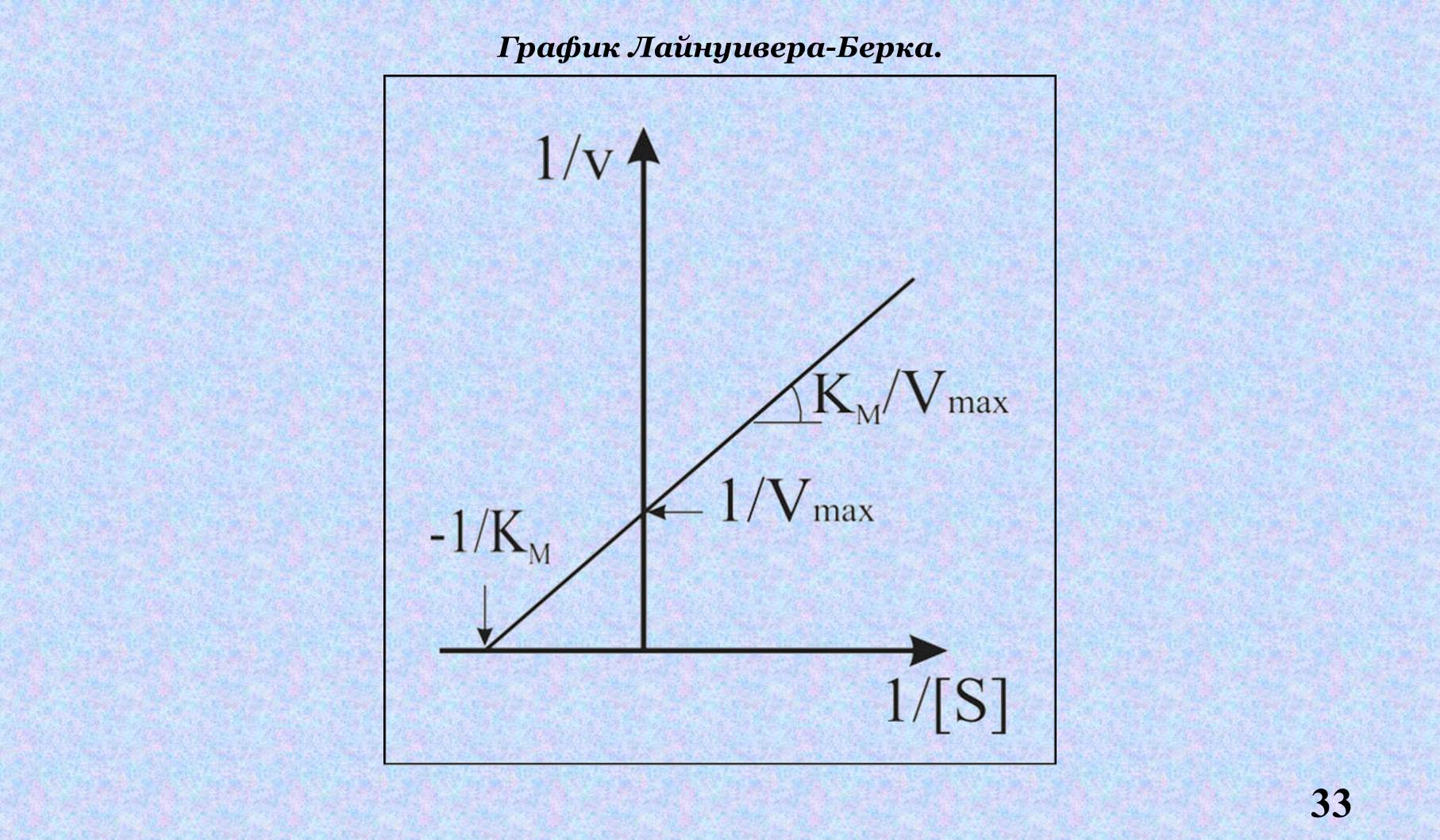 Км – константа Михаэлиса – это концентрация S, при которой скорость соответствует Данная величина изображается также по методу двойных обратных величин – график Лайнуивера-Берка.