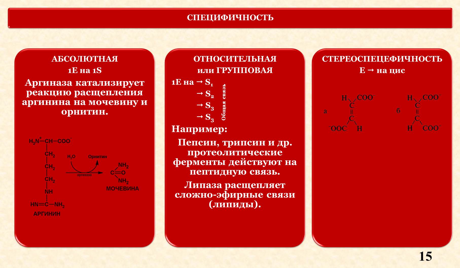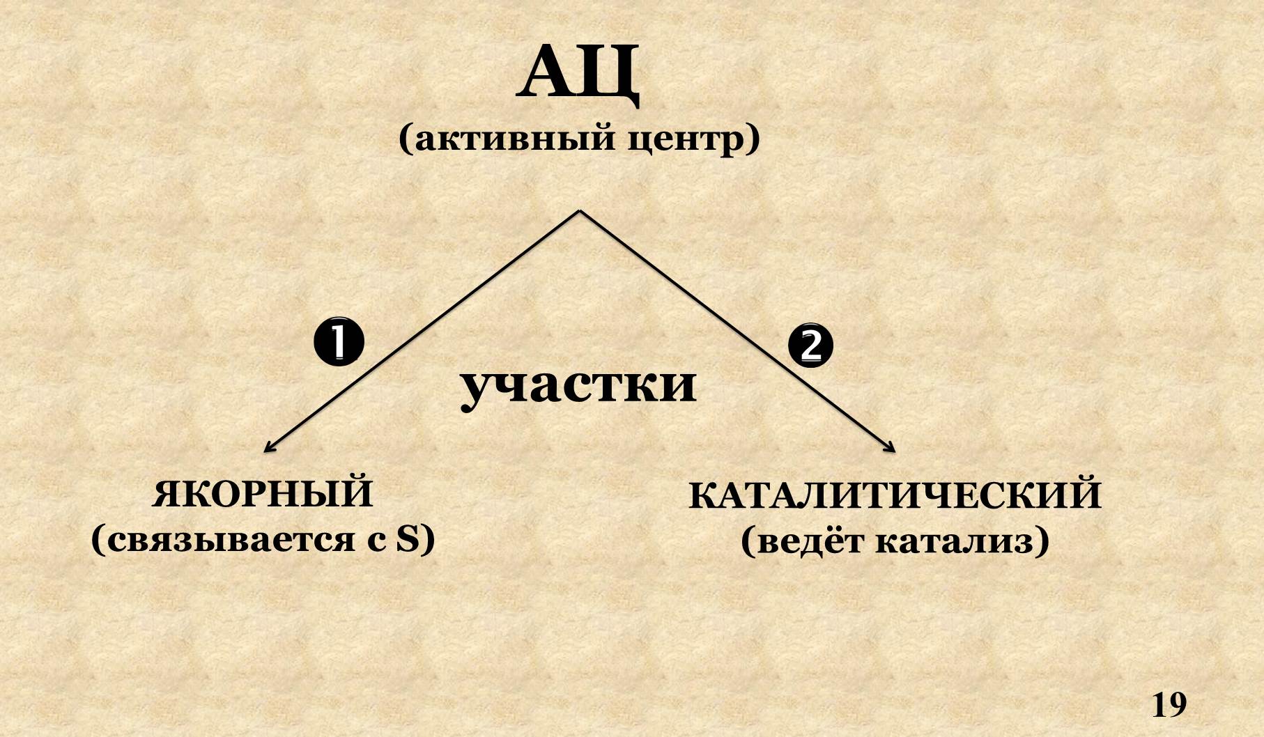 Активный центр – уникальная комбинация аминокислотных остатков, участвующих в присоединении S и ведении катализа, формируется на уровне третичной структуры.