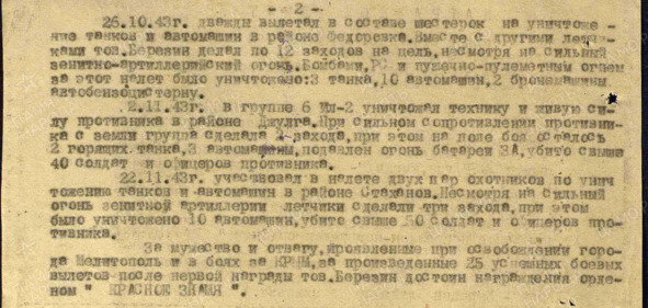 За мужество и отвагу, проявленные при освобождении города Мелитополь и в боях за Крым, за произведенные двадцать пять успешных боевых вылетов, после первой награды Березин достоин награждения орденом Красного Знамени.