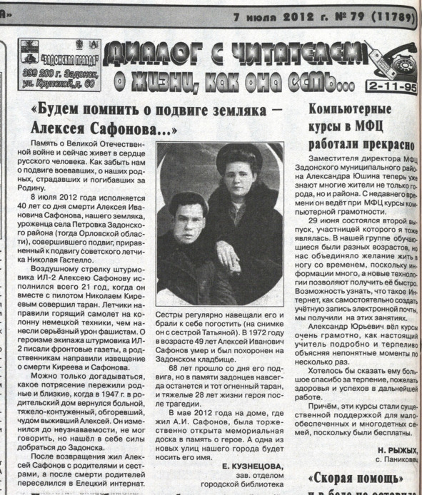 Считалось, что и пилот, и воздушный стрелок погибли. Родственникам направили извещения о смерти Киреева и Сафонова. Но Алексей Иванович чудом остался жив. И не был отмечен никакой воинской наградой за свой подвиг. Глухонемой, разбитый параличом, в июне 1947 года он вернулся домой, в Задонск. Родные с трудом его опознали.