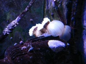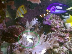 Но проблема была, и проблема серьезная: эта мелкая беленькая актиния все время садилась таким образом, что принудительно накормить ее возможности не было никакой (Вы никогда не пробовали накормить настенный коврик? Вон он, беленький-кудрявенький, из правого дальнего угла аквариума свисает!)…