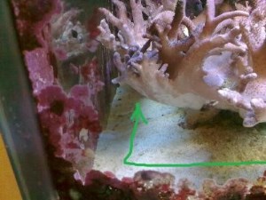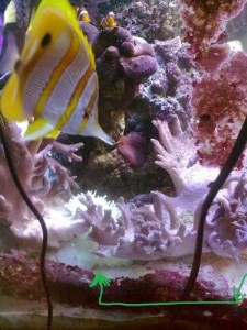 В углу, куда направлялась актиния и далее, вдоль левого бокового стекла, и почти вплотную к нему, пышно колосились два куста коралла синулярии. (зеленая стрелочка на фото отмечает направление движения зверюшки; это вид аквариума спереди).