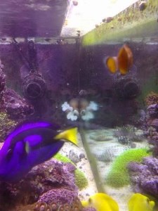 Надо сказать, что до того, как попасть к нам, новенький мальчик жил в магазине, в полупустом отсеке аквариумной стойки, предназначенной для передержки привезенных морских жителей. Мальчик плавал там в компании огромного (по сравнению с ним) томатного клоуна и мизепузерного (с пятирублевик размером) голубого хирурга. В качестве "элементов оформления" в отсеке присутствовали только несколько совсем крохотный актиний-сорнячков – и всё, больше ни песчинки, ни травинки, ни камушка, даже малого.