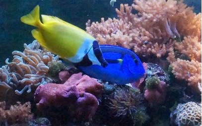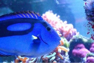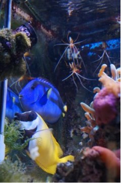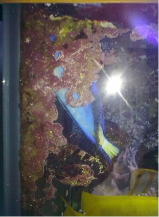 Вскоре Синий, в качестве альтернативы ленивице креветке, нашел средство для облегчения своей участи: маломощную помпу, перемешивающую воду в аквариуме. Синий подолгу зависал над ней, над входящим потоком. Видимо, так ему было легче переносить чесотку. Еще через несколько дней он уже выучился подолгу «стоять», прямо на помпе (на решетке, через которую вода попадает внутрь), используя свой хвост как человек – ступню (к сожалению, качество фотографии очень плохое, и сам Синий наполовину скрыт коралиновой водорослью, покрывающей часть стекла – собственно, только его сине-желтый хвост на помпе и виден).