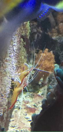 На фото: две креветочки-доктора сидят на стене аквариума. Точнее – на коралле, покрывающем одну из стенок аквариума. Кораллы – они тоже разные бывают: и как газончик, и как дерево, и как типичный неопознанный летающий объект, совершивший посадку на морском дне..