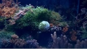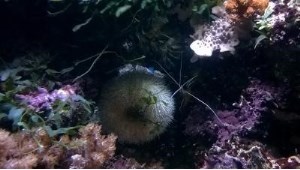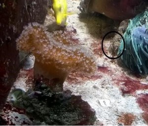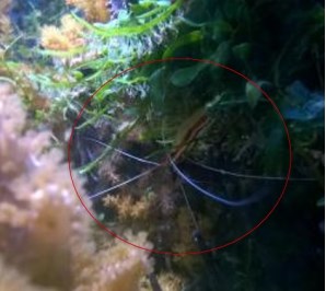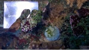 Я обхожу аквариум и смотрю – что там с новенькой креветкой. Ну, вроде все в порядке – пошла исследовать кущи\чащи и уже сидит на коралле синулярии.