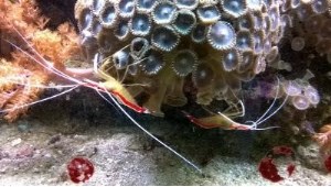 Слово третье – о креветкахМини-креветочки (размера S или примерно сантиметров 5 без усов – точно такой же, как был у креветочки, полученной накануне нового года, да-да, той самой, которая теперь авторитетно распускает усы на полаквариума!) были выпущены на почтительном расстоянии друг от друга. Однако, как и следовало ожидать, с утра обнаружились сидящими, как две художественные фигурки на одной полке, абсолютно симметрично сидящими на одной зоантусовой поляне. В отличие от креветки-старожила, которая сидит ровнехонько на том же месте, но… с противоположной стороны горного хребта! Это что же они – теперь против нее дружить будут, что ли?