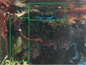А вот здесь вечерние замеры в сантиметрах – увы, Страшилище хотело питаться именно там, где было чем, то есть на заросшей коралиновой водорослью-«леденчиками» части, сквозь которую ничего, кроме зловещего темного силуэта, не видать…