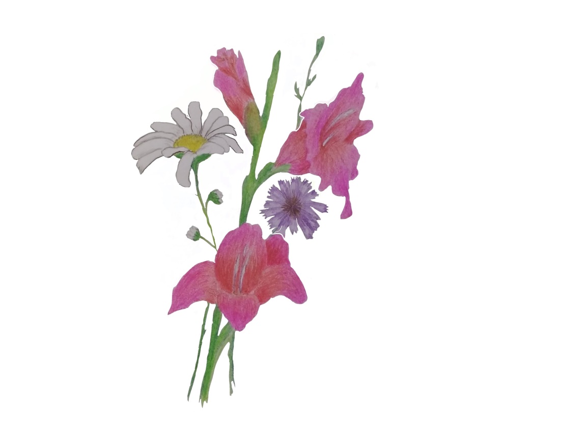 Ребята собрали красивый букет, состоящий из гладиолусов, ромашек и ещё всяких других полевых цветов.