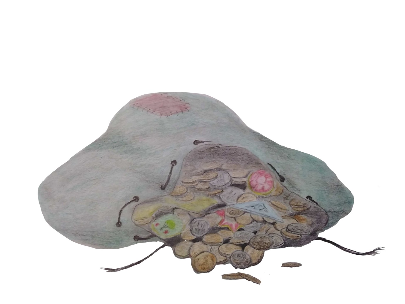 Катя нарвала травы, собрала растения в веник и начала мести пыль. Когда Катя дошла до правого угла будки, она увидела там старый деревянный ящик. Катя взяла его и волоком вытащила ближе к свету. На свету в ящике Катя увидела потрёпанный, старый мешочек. Катя потянула за верёвку. Раскрыв мешочек, девочка увидела в этом мешке монеты и значки.