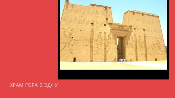 Храм в Эдфу, посвященный богу Гору является вторым по размерам после Карнака – 137 метров в длину, 79 – в ширину, высота пилонов 36 метров. Он существовал с древнейших времен. Позднее, при Птолемеях, был отстроен по древним планам. На стенах храма множество иероглифических надписей на разные темы, в том числе рецепты благовонных мазей.