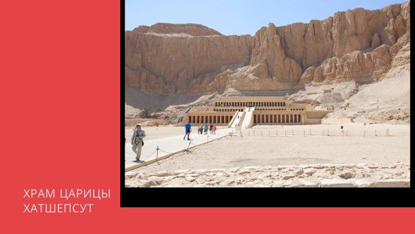 По приказу Хатшепсут, одной из 5 женщин-фараонов за всю историю Египта, был построен заупокойный храм в начале XV в. до н.э. архитектором Сенмутом. Храм расположен на фоне скал, он состоит из трех огромных платформ, соединенных пандусами (наклонными площадками). Вероятно, раньше они были в зелени.