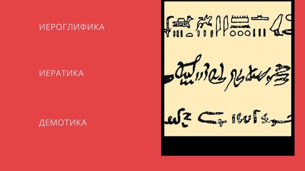 Для ускоренного написания используют упрощенные знаки, так возникает иератическое письмо, когда знаки становились более округлыми. А в I тыс. до н.э. появляется скоропись – демотическое письмо. Египтяне писали справа-налево, а новый абзац начинали красной краской. Отсюда происходит выражение "Писать с красной строки".