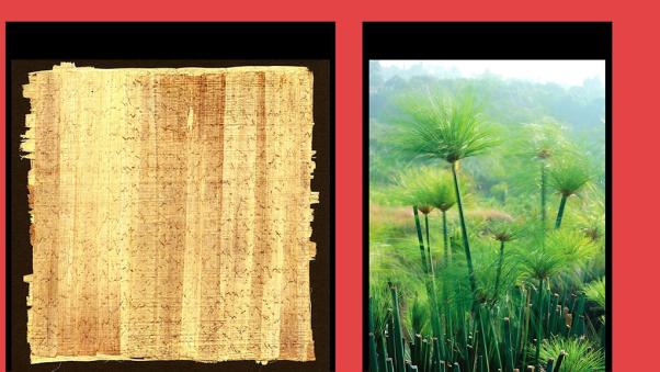 Его делали из растения папирус, который как сырье называли – библ. Его ствол разрезали на полоски, раскладывали по форме готового листа сначала вдоль, потом поперек. Затем отправляли под пресс, доставали, отбивали молотком, промазывали клеем и высушивали на солнце.