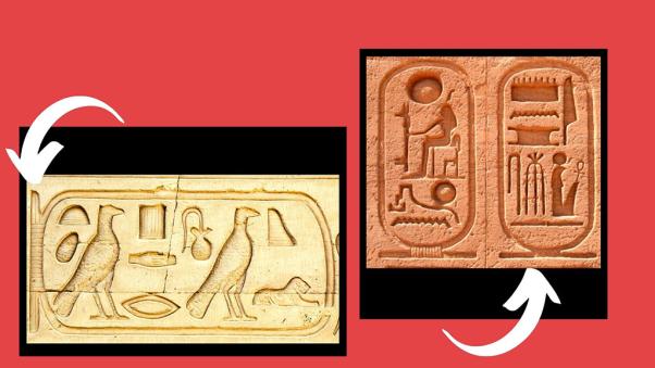 Для имен фараонов был особый способ записи: их вписывали в специальную форму. Наиболее распространенный вид – картуш (или шену) – это овальный контур с линией. Если овал вертикальный, то линия горизонтальная, а если горизонтальный, то линия – вертикальная. До картуша был серех, который украшался фасадом и планом дворца.