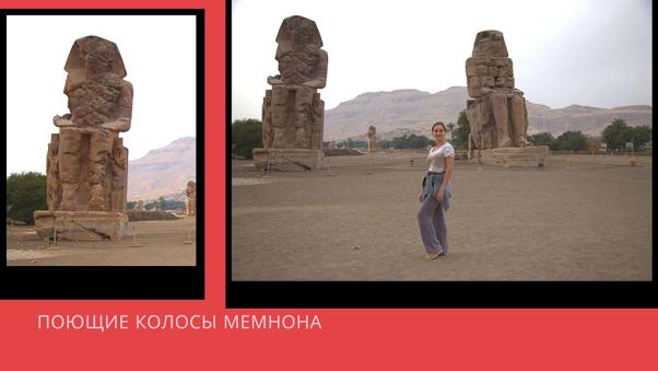 Еще две скульптуры, на которых я хочу остановить Ваше внимание, это гигантские статуи фараона Аменхотепа III, созданные в XIV в. до н.э. и расположенные недалеко от храма царицы Хатшепсут. Когда в результате землетрясения I в. н.э. один был поврежден, то на восходе солнца стал издавать звук. Вероятно, его причиной была резко испаряющаяся роса. По этому звуку настраивали музыкальные инструменты. За это скульптуры получили второе греческое название "поющие колоссы Мемнона", в честь мифического царя, сына богини утренней зари – Эос. Однако после реставрации, проведенной по приказу римского императора Септимия Севера в конце II в., звуковой эффект исчез.